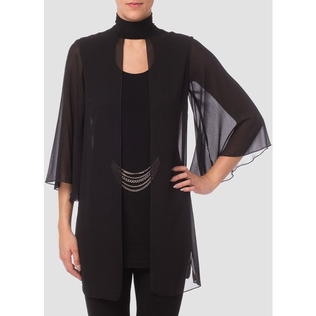 Joseph Ribkoff 173276 musta juhlatunika, jossa on edessä ketjusomisteet ja kauluksessa nauhakoriste. Hihat näyttävät: leveät sifonkiset.